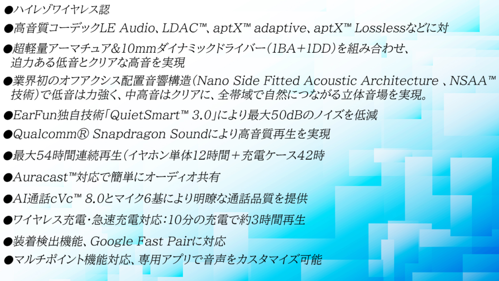 今回は「EarFun Air Pro 4+」をレビューしていきました。「EarFun Air Pro 4」の最新モデルであり、世界初の技術が使用されたTWSです。ハイレゾ音源LDACはもちろん、低遅延コーデックapt-x LLに対応。高級感のあふれる見た目で、氷のように冷たい中に温かみを感じ、力強さを与える音を奏でることができます。Bluetoothの接続性に少し難のあるところが惜しいですが、その他は最高に素晴らしく、2025年で購入したイヤホンで最もおすすめできるTWSです。