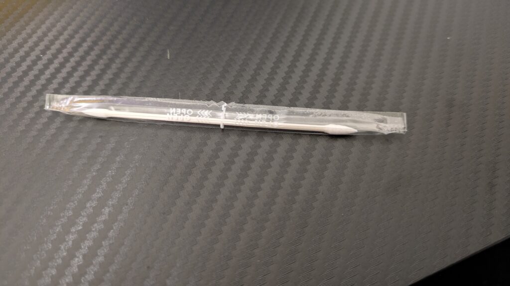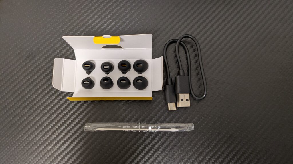 付属品は充電用ケーブルにイヤーピース、説明書等といつもの付属品が付いていますが、一点気になるものが入っていました。それがこの綿棒です。これ、公式ページにも記載されていないんだけど、恐らくは掃除用?の精密綿棒と思います。これで「綺麗に保ってね」と言う意思を感じます。しっかりお掃除します。