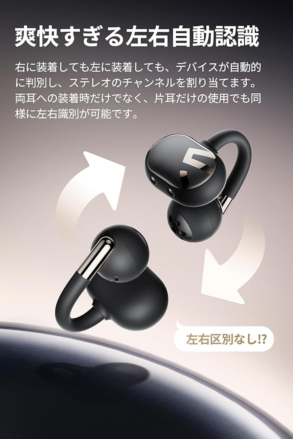 また素材や構造だけでなく、少し変わった機能が2つ搭載されています。1つ目が「左右自動識別テクノロジー」です。名の通りイヤホンを装着した際、左右を自動で識別しステレオのチャンネルを割り当ててくれます。片耳だけでの使用でも左右を識別してくれます。2つ目の機能は「装着検知」です。この装着検知はセンサーでイヤホンの着脱を感知し、音楽の停止・再生を自動で行ってくれます。あまり見ることのない機能が2つ搭載されているのがSOUNDPEATS Clip1の魅力の一つです。