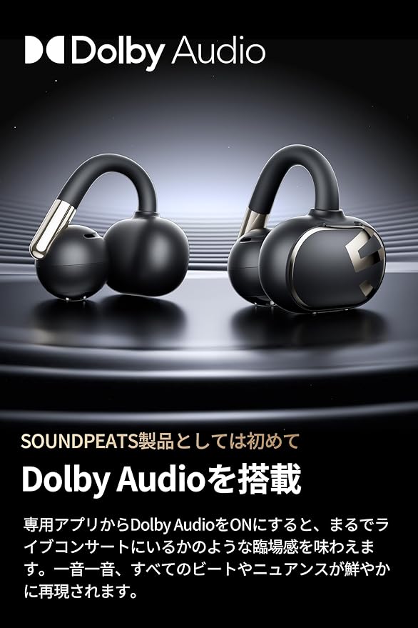 SOUNDPEATS Clip1の最も注目するべき性能は何と言ってもDolby Audio対応です。なんとSOUNDPEATS初のDolby Audio対応製品がClip 1となっており、まさか初のDolby Audio対応製品がイヤーカフ型になるとは驚きです。Dolby Audioに対応しているため、今までのイヤーカフ型では体験することのできなかった臨場感溢れる音を楽しむことができます。