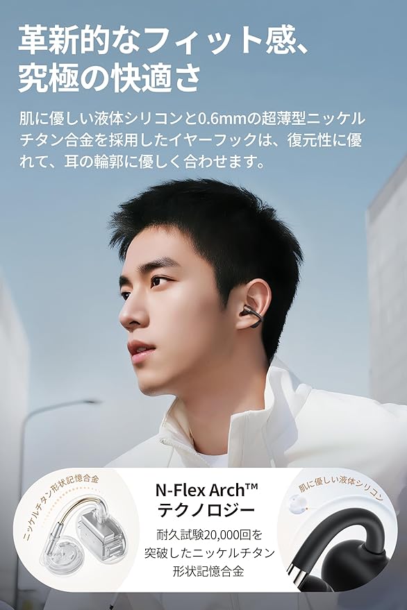 音質だけでなく着け心地もこだわりを感じる仕様となっています。イヤホン本体は肌に優しい液体シリコンが使用されており、すべすべと触り心地がとても良い素材になっています。また、0.6mmの超薄型ニッケルチタン合金を採用したSOUNDPEATS「N-Flex Arch™」構造により、どのような耳の形状でもフィット感ある着け心地になっています。